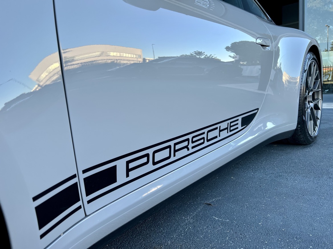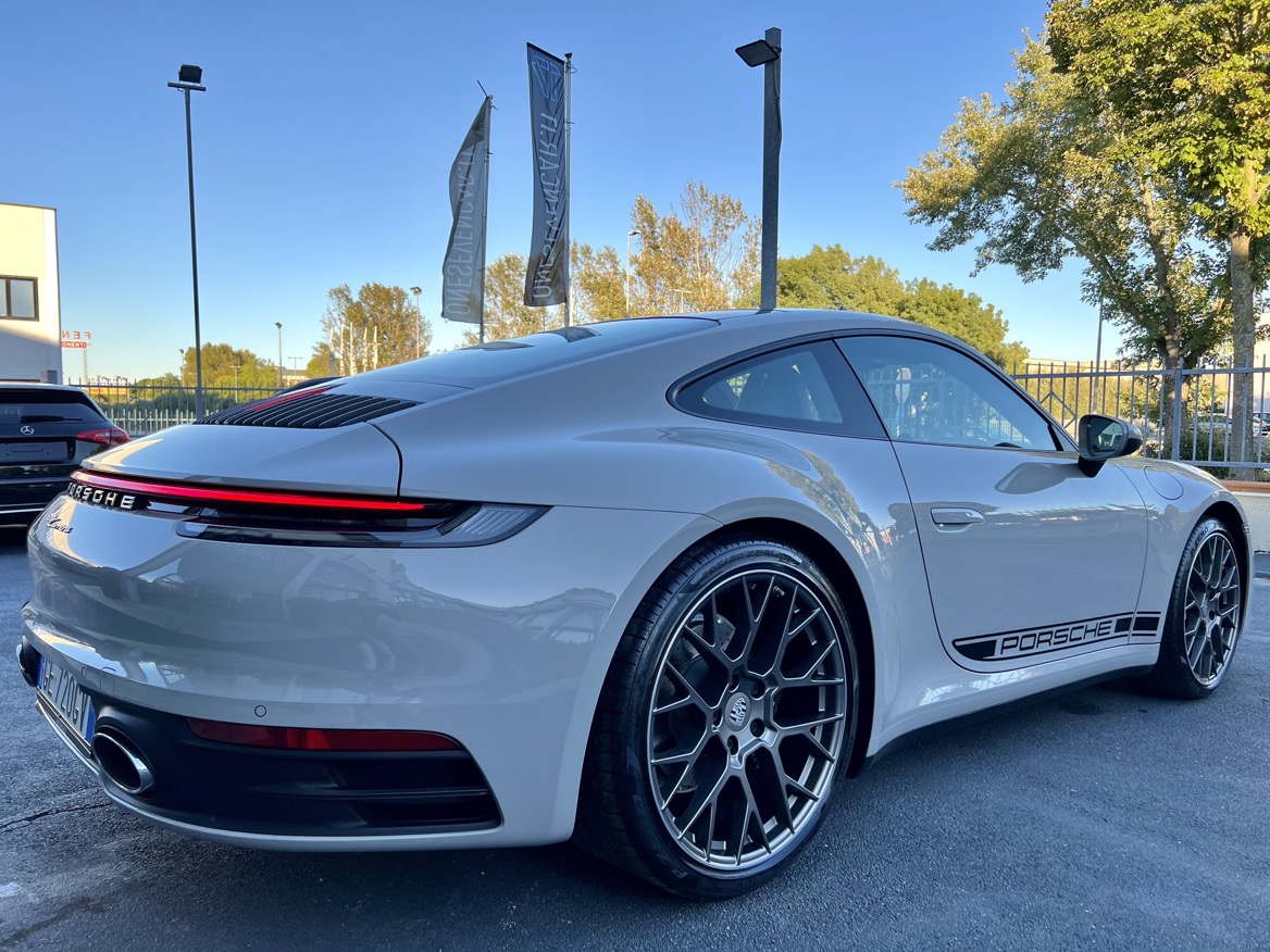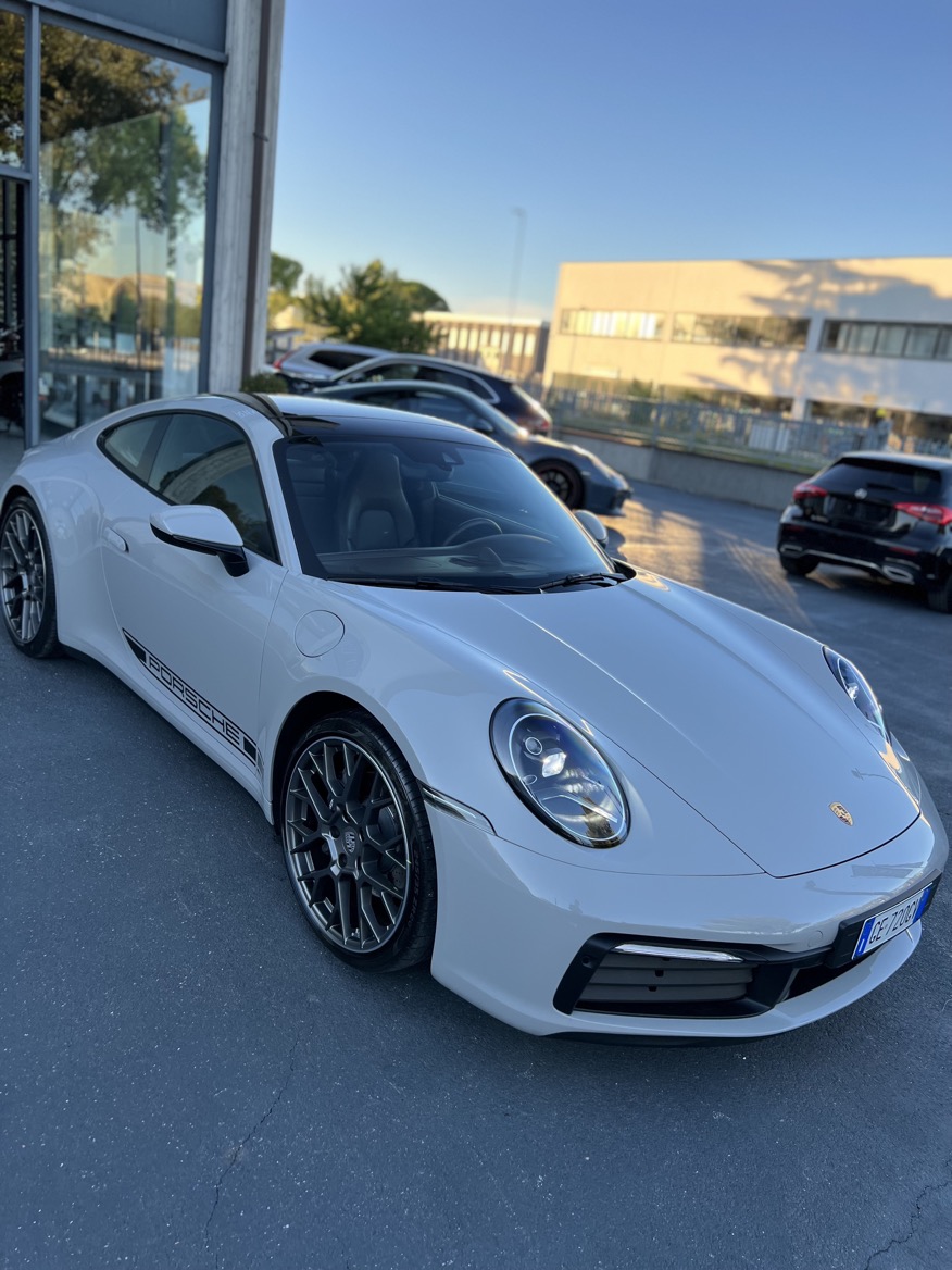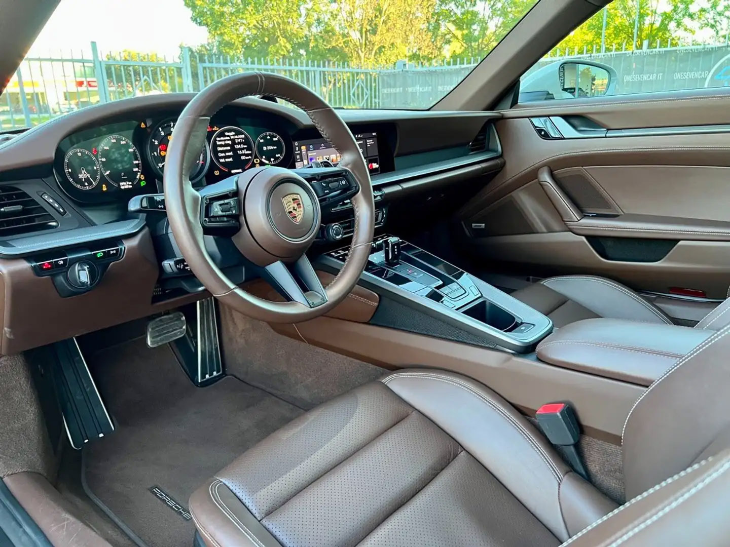 Stupenda Porsche 992 in una configurazione davvero unica colore esterno Gesso interno in pelle totale marrone tartufo con impunture bianche.